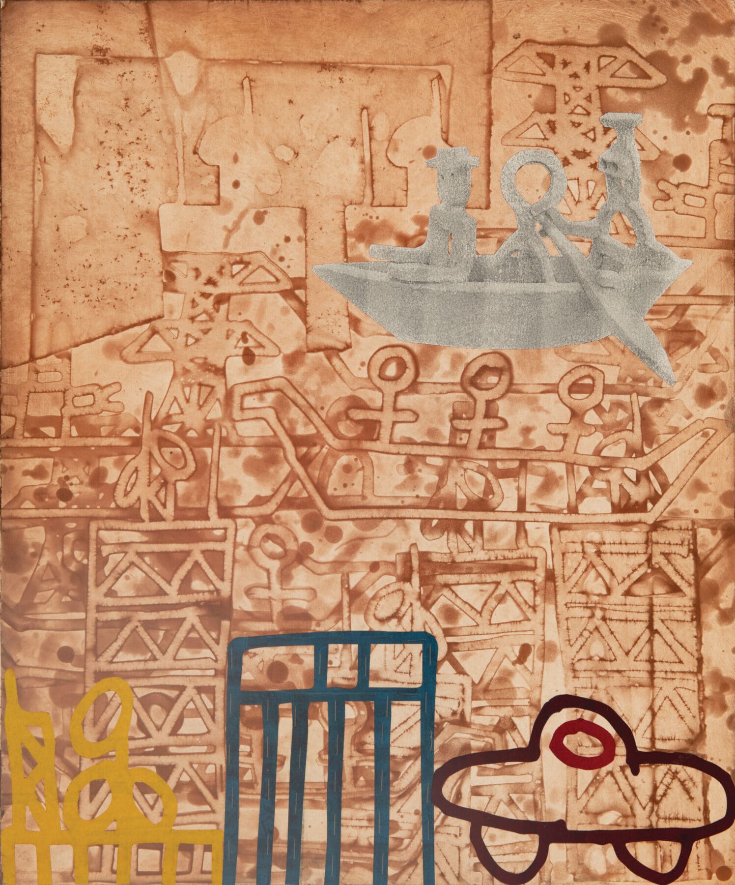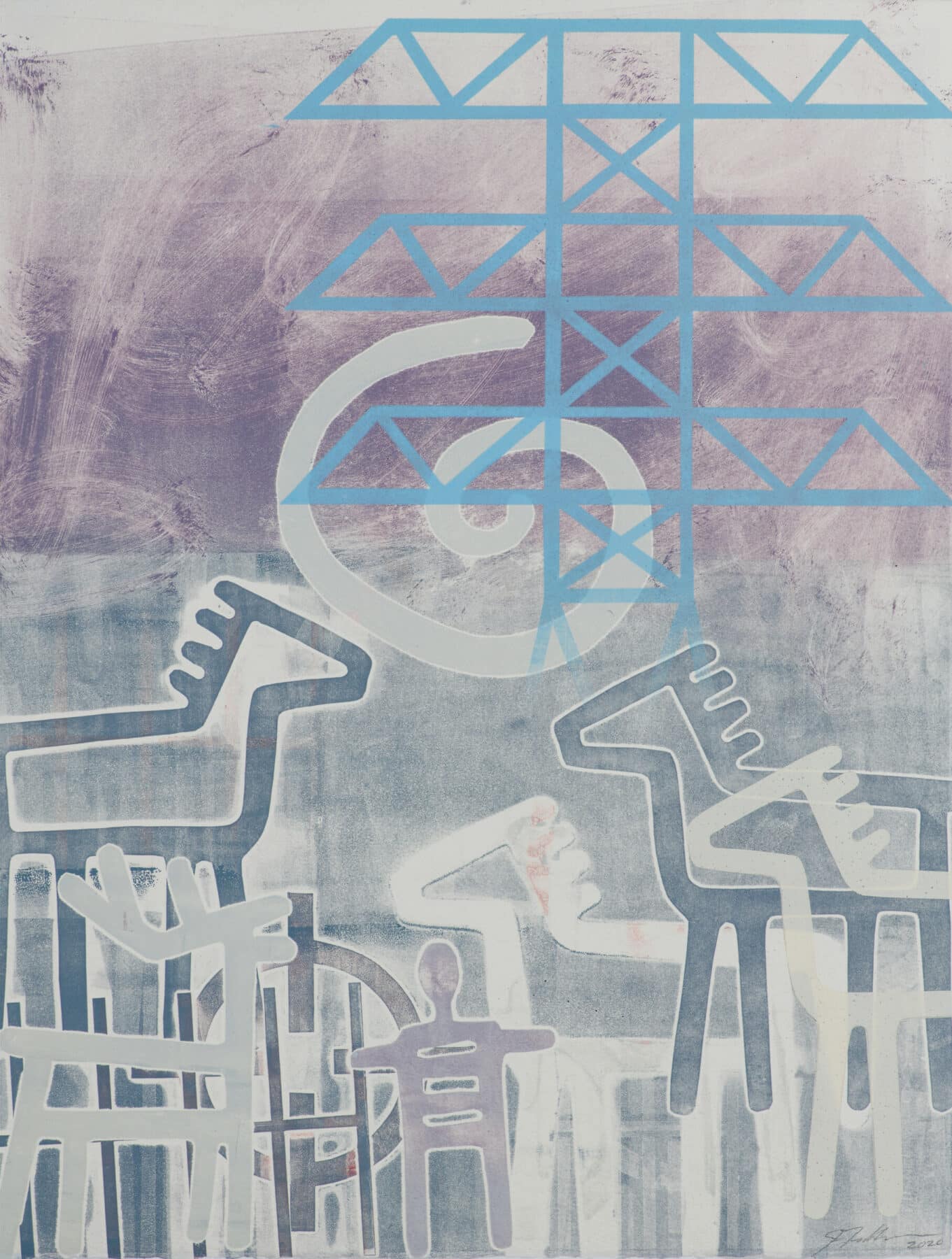 Joe Feddersen Omak Lake 2, 2019; monoprint on paper with spray paint; 19 1/2 x 15 inches Three figures dominate artist Joe Feddersen’s print Omak Lake 2: a deer, or perhaps a ram, head extended toward the outstretched arm of a human with a turtle-like torso—or are those stylized lungs?—and View Gallery