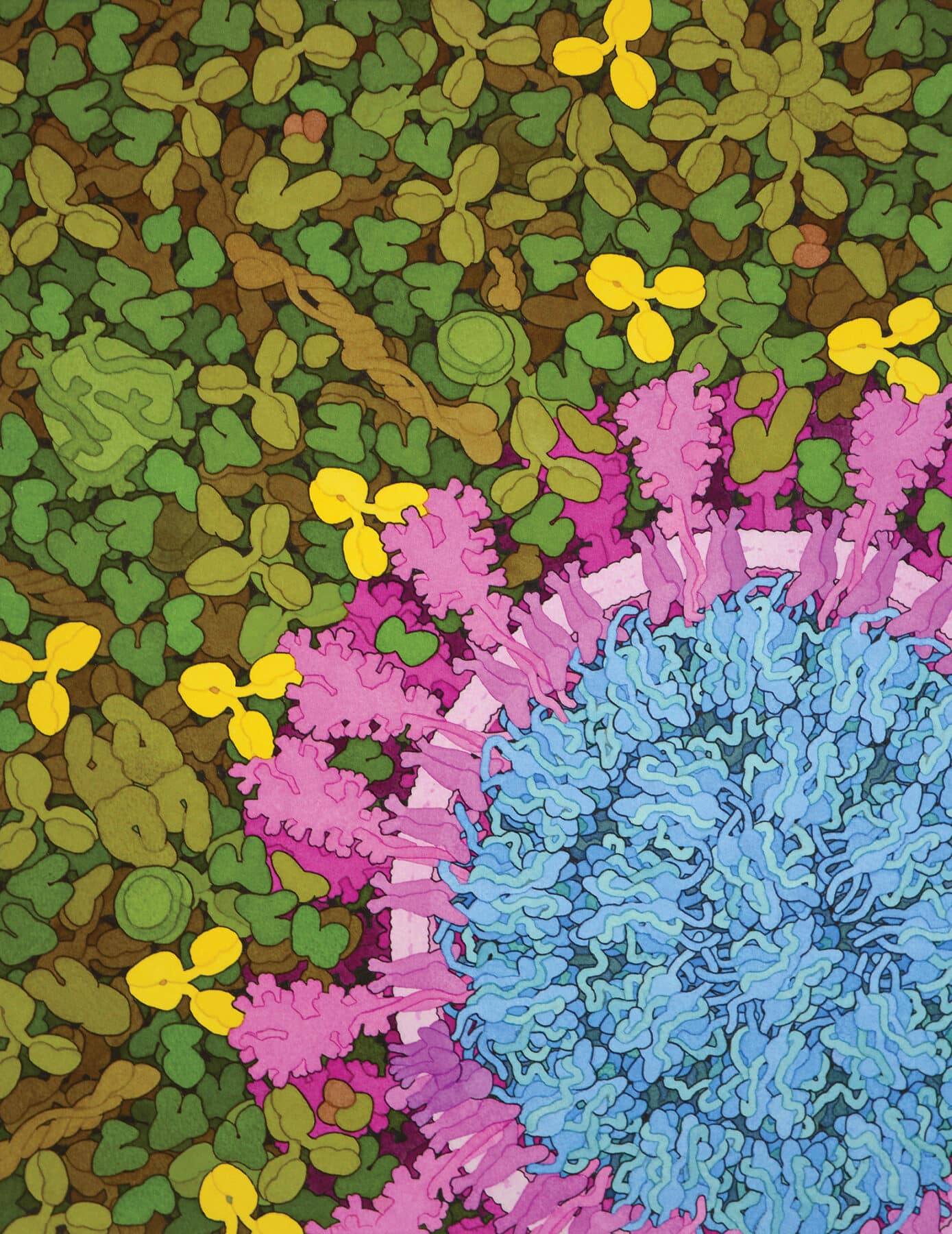 DAVID S. GOODSELL, Molecular Landscape: SARS-CoV-2 and Neutralizing Antibodies, 2020, watercolor, 13 x 10 inches, collection of the National Academy of Sciences. In this watercolor painting, a cross section of the SARS-CoV-2 virus that causes the COVID-19 disease is surrounded by blood plasma, with neutralizing antibodies depicted in bright yellow. View Gallery