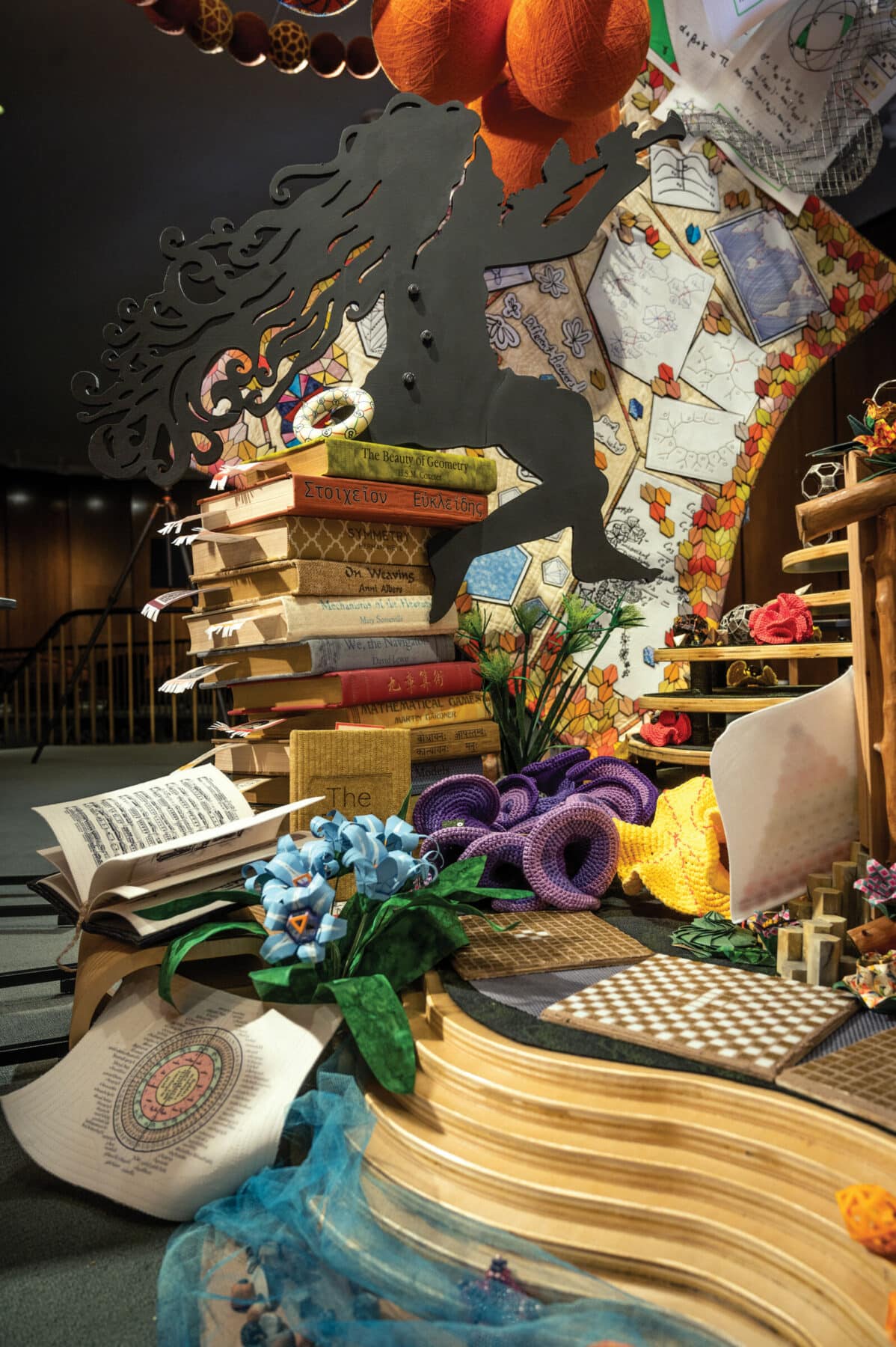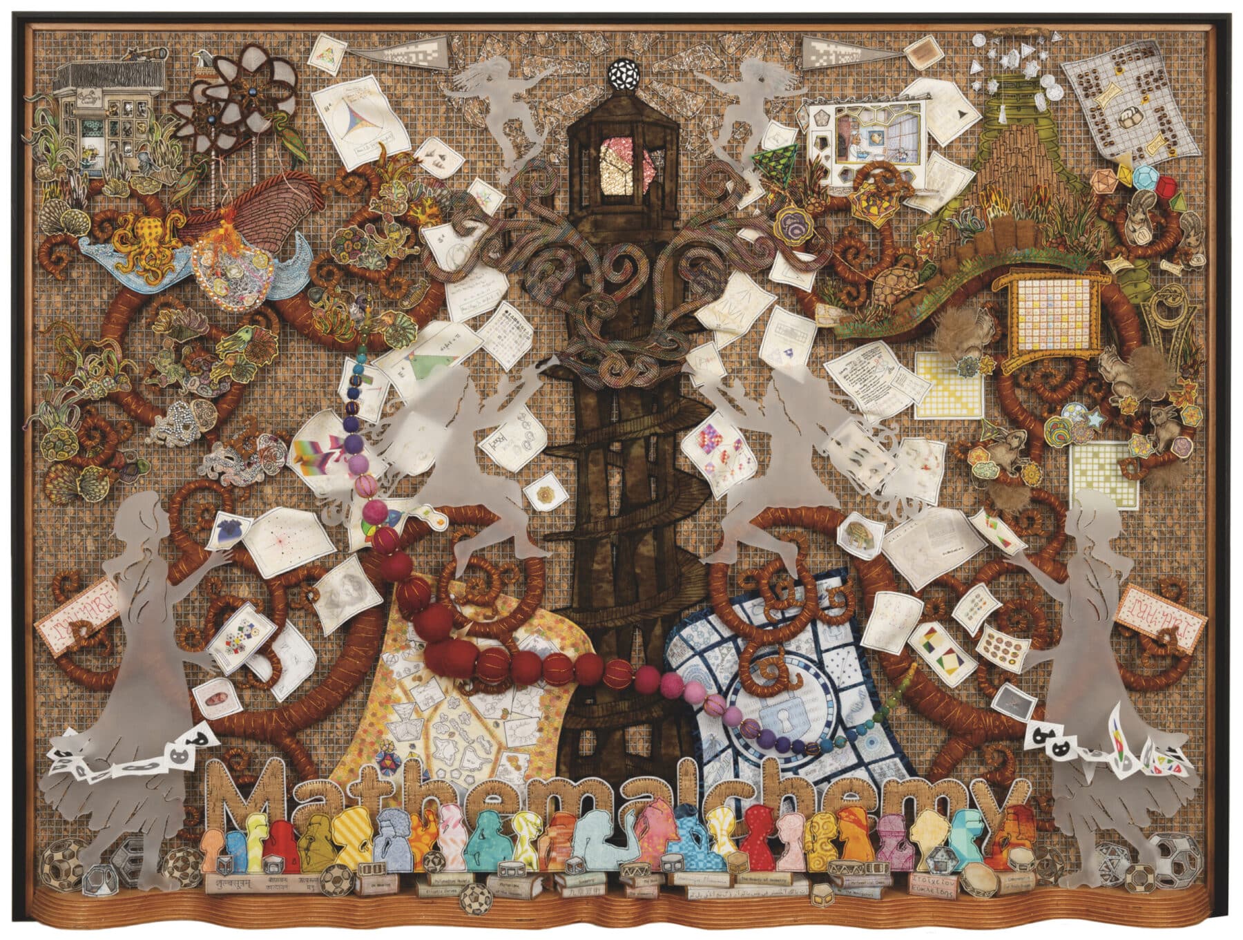 Dominique Ehrmann, A Curious Collaboration, 2022–2023, textiles and acrylic on cork with wood frame, 30.5 x 40.5 x 3.5 inches. Permanent collection of the National Academy of Sciences. This artwork documents Mathemalchemy, a multimedia art installation that was on view at the National Academy of Sciences (NAS) in 2022 and featured in the Spring 2022 Issues. View Gallery