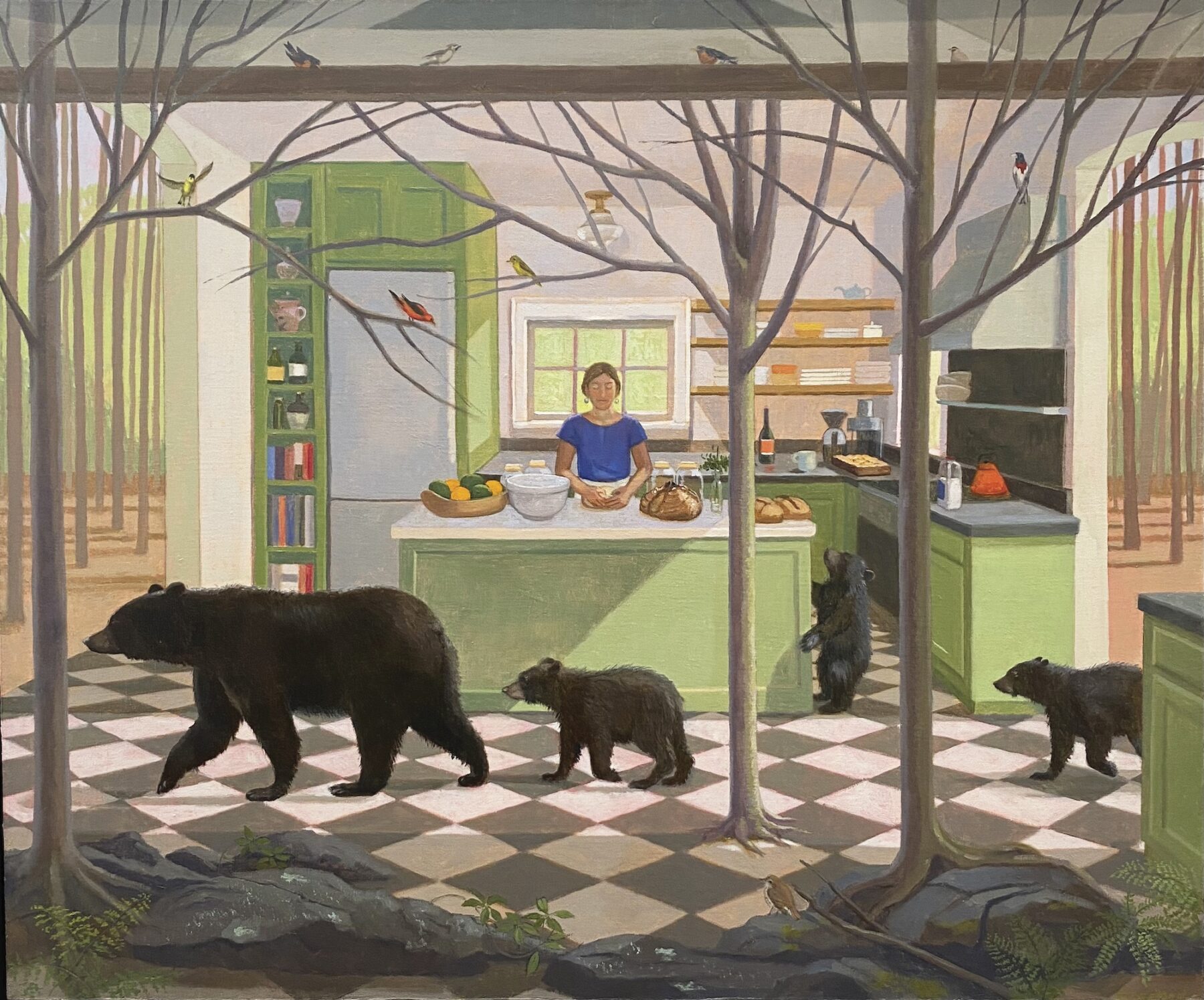 In her enchanting narrative paintings, Kathryn Freeman imagines a world where people coexist with flora and fauna in moments of leisure and creativity.