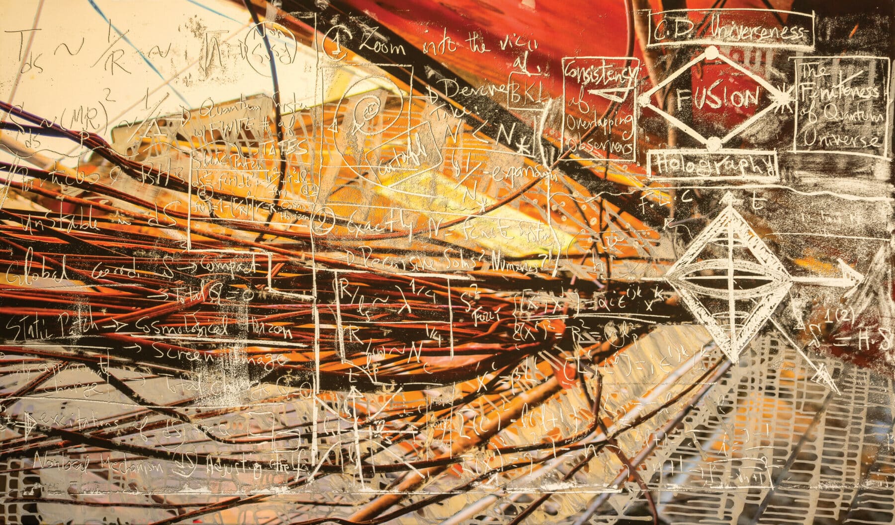 Quantum System, 2020, 39 x 69 inches On a trip to Brazil, artist Steve Miller was captivated by the tangled web of power lines in Rocinha, Rio de Janeiro, the largest favela in the country. View Gallery